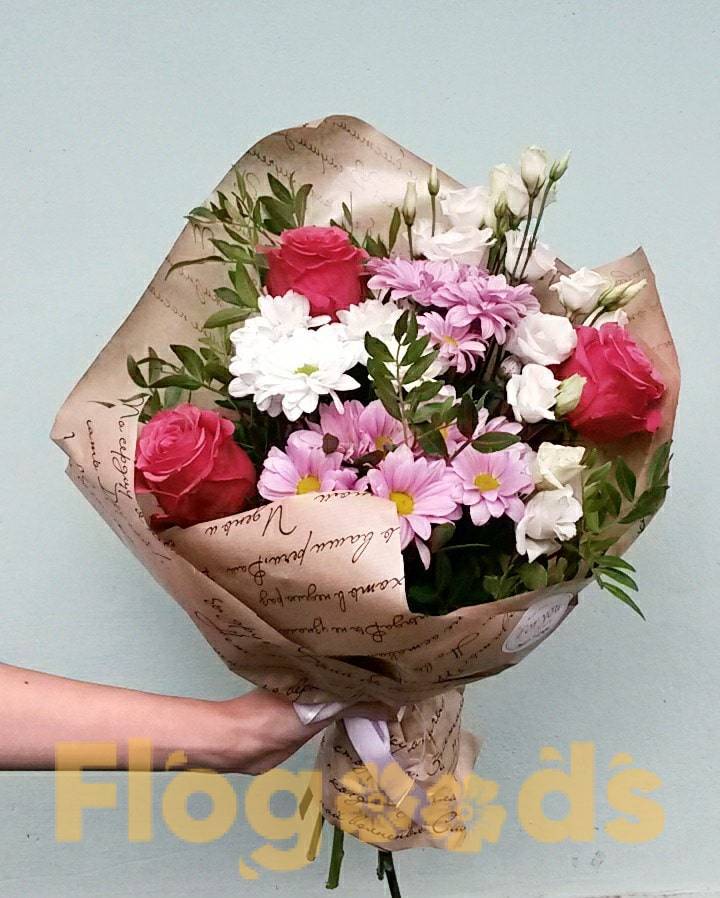 Нарядный букет из хризантем в сочетании с 3 розовыми розами – это неповторимый подарок, он понравится незамужним романтичным особам. Сочный и нежный набор для любимой дамы на любое важное событие.